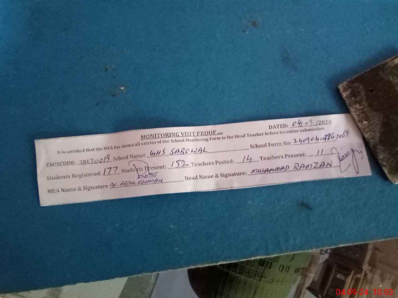 | Attendance Register | Head Teacher | MEA with School | Visit Proof |