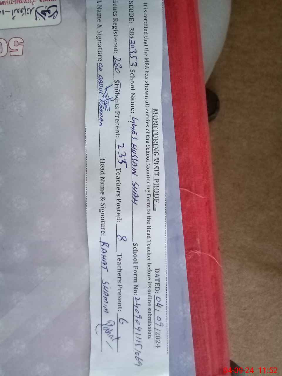 | Attendance Register | Head Teacher | MEA with School | Visit Proof |