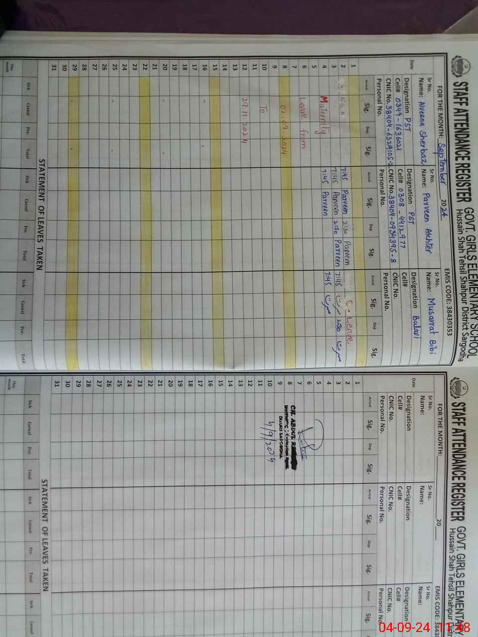 | CNIC | Full Name | Designation | R/C | Absence During Last Calender Month |