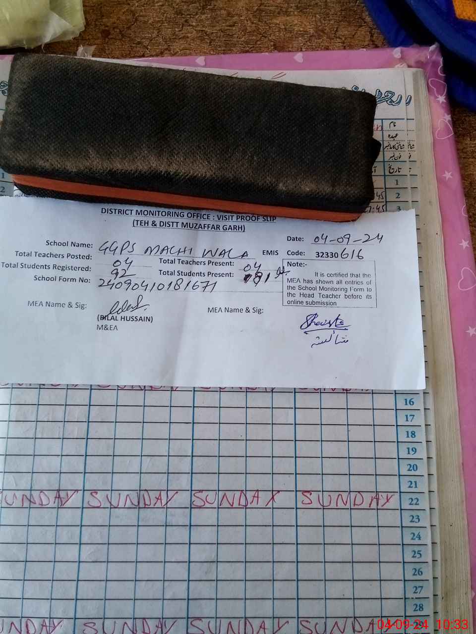 | Attendance Register | Head Teacher | MEA with School | Visit Proof |