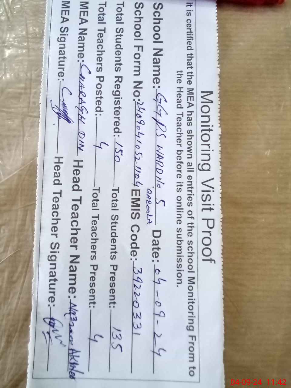 | Attendance Register | Head Teacher | MEA with School | Visit Proof |