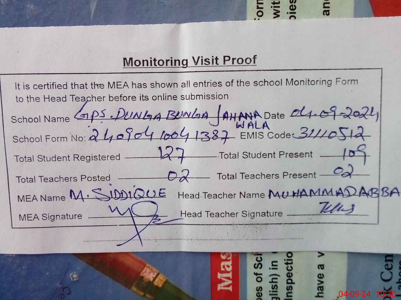 | Attendance Register | Head Teacher | MEA with School | Visit Proof |