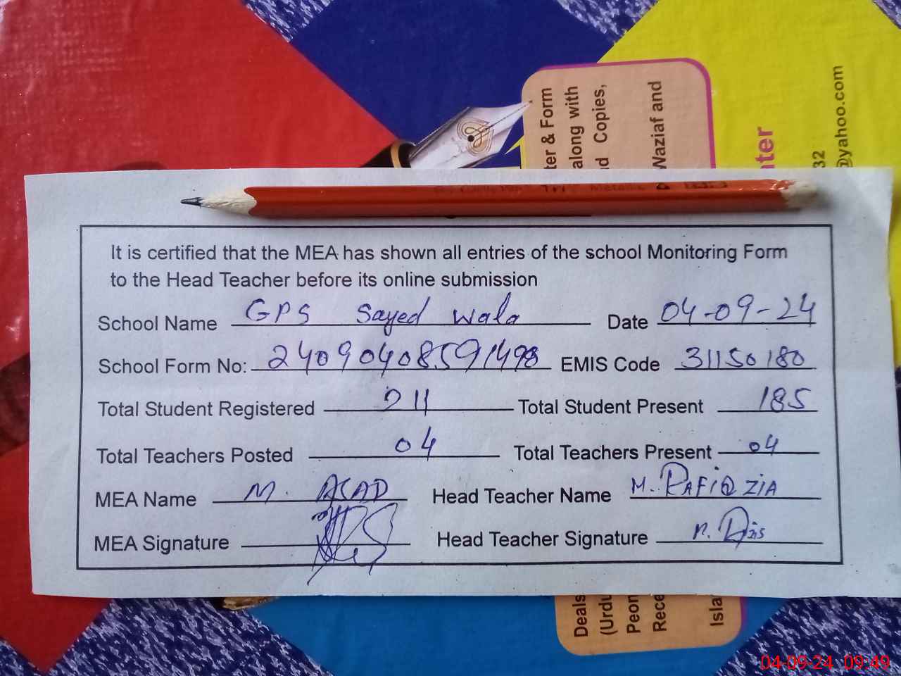 | Attendance Register | Head Teacher | MEA with School | Visit Proof |