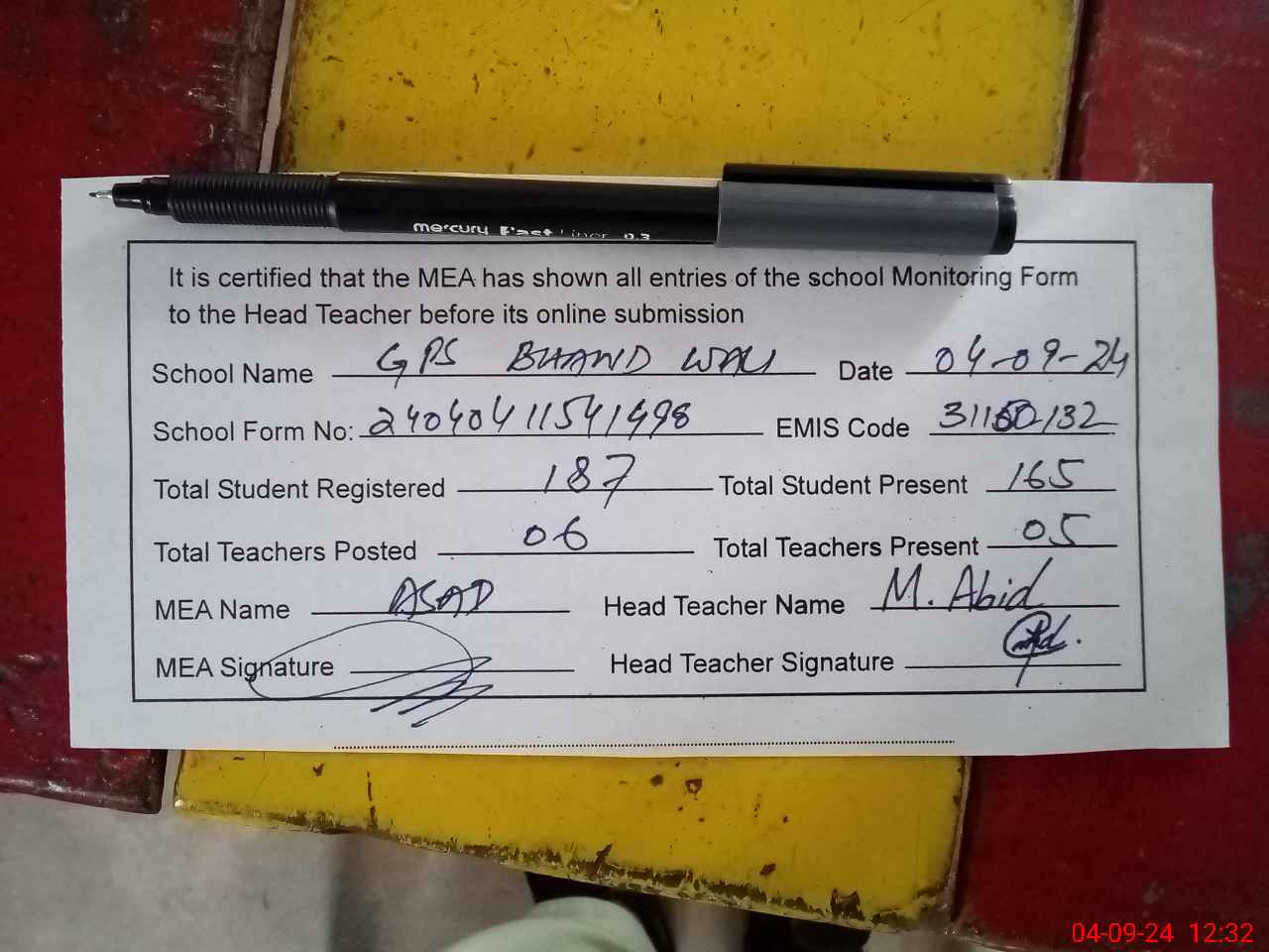 | EMIS Code: 31150132 | Name of School: GPS BHAND WALI | |||