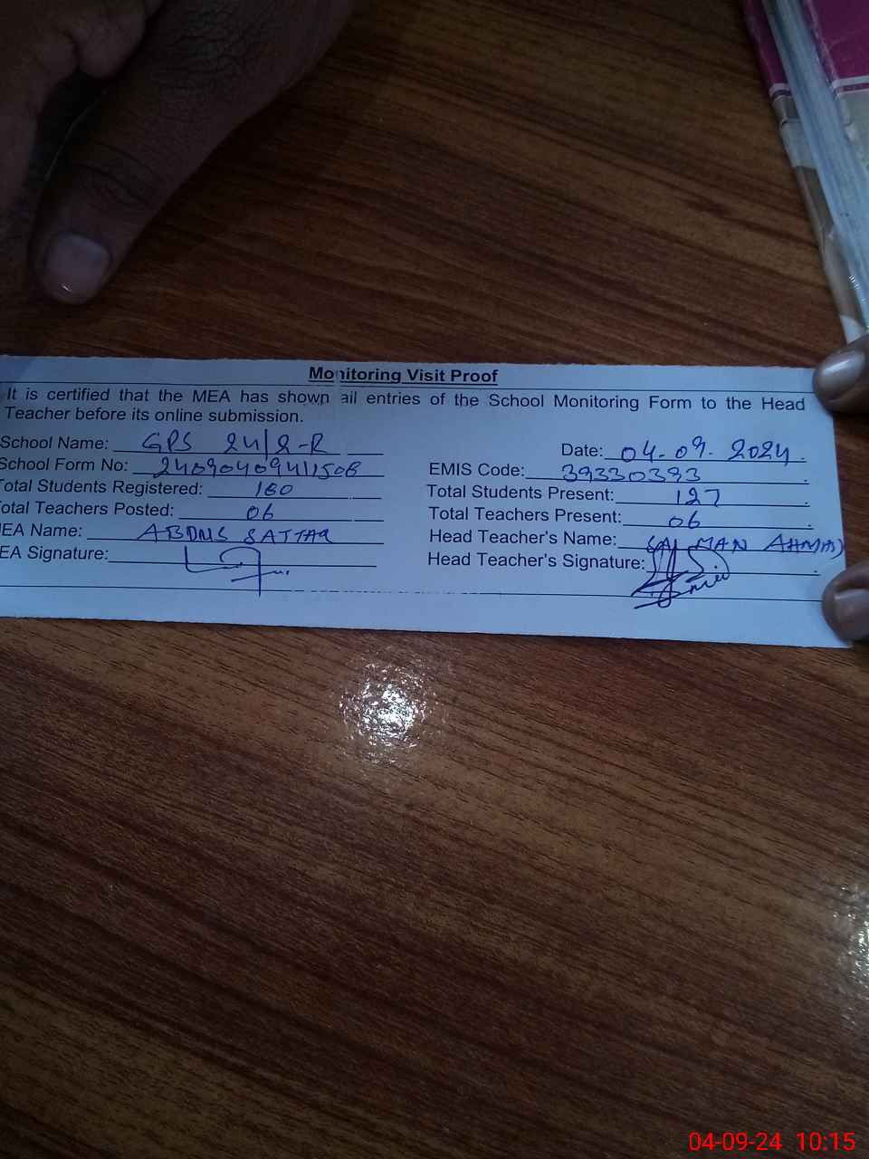 | EMIS Code: 39330393 | Name of School: GPS CHAK NO. 24/2-R | |||