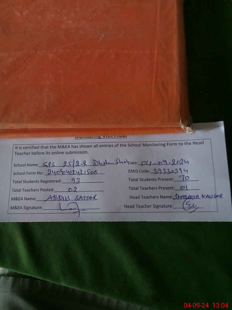 | Attendance Register | Head Teacher | MEA with School | Visit Proof |
