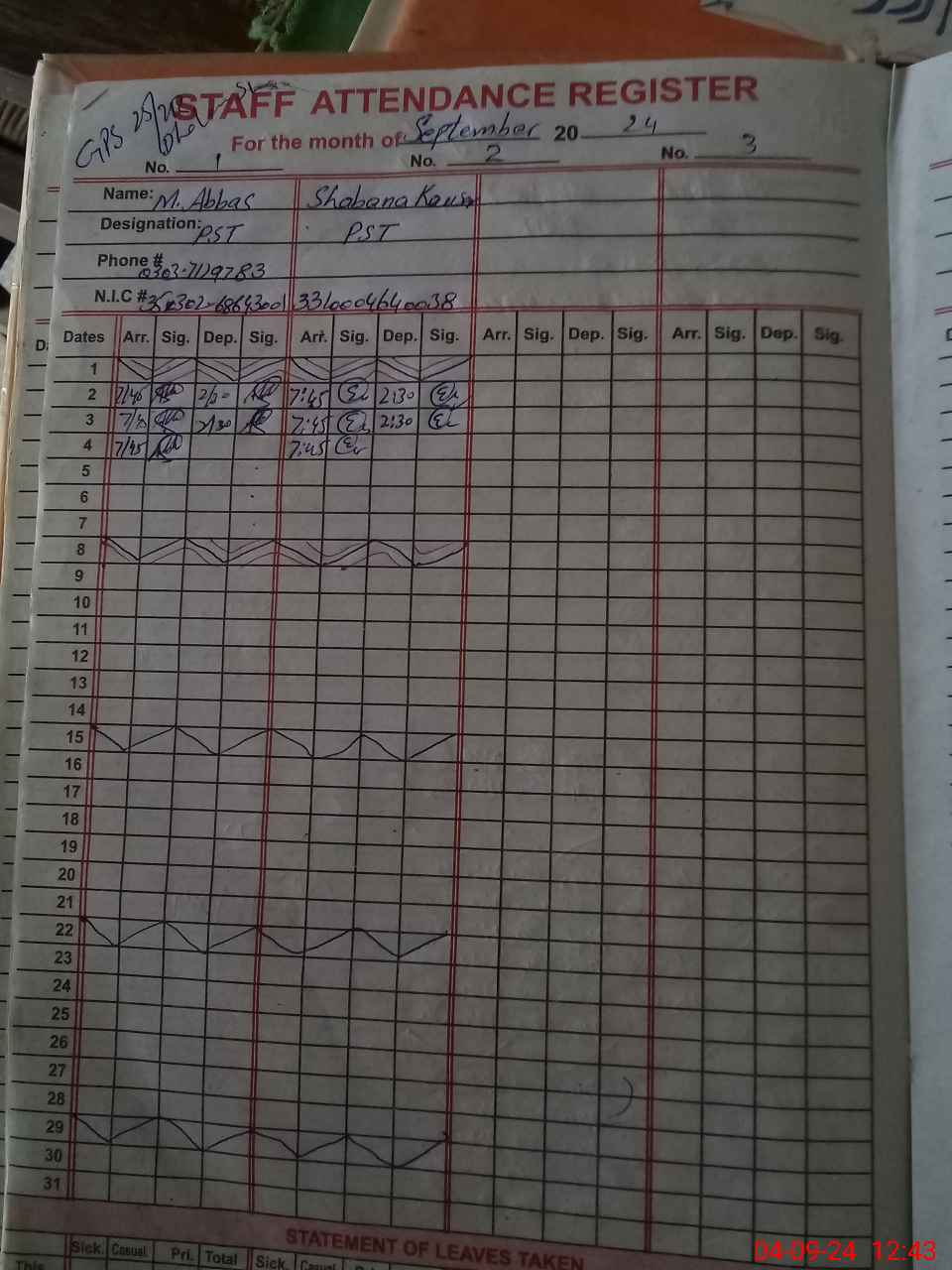 | CNIC | Full Name | Designation | R/C | Absence during last cal. month |