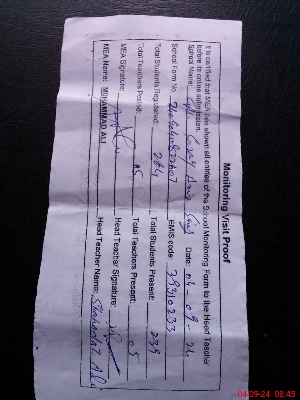 | Name: Sh**** Al**** Designation: (School Headmaster's/Headmistress's) PST Phone/Cell Number: 03**** |