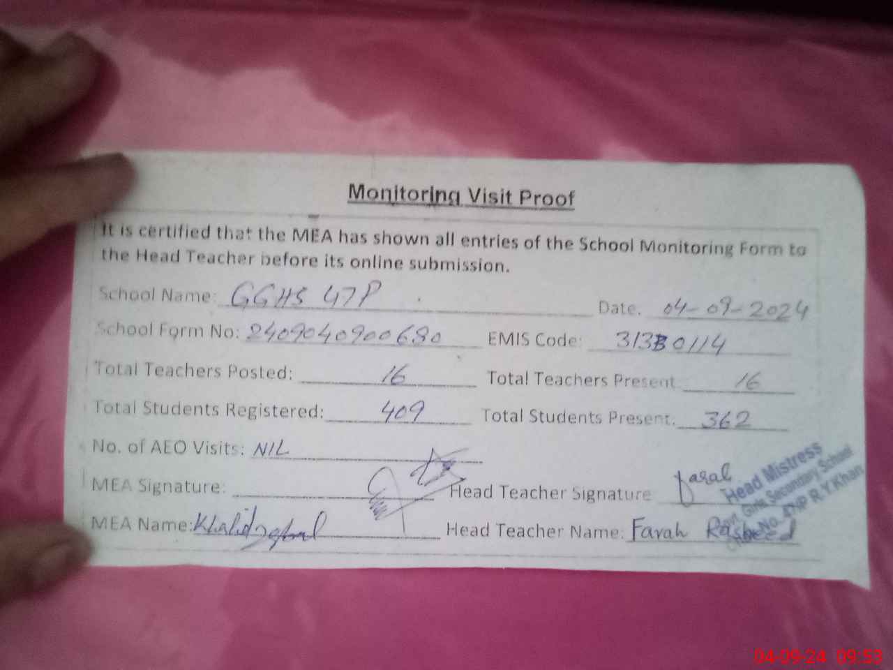 | Attendance Register | Head Teacher | MEA with School | Visit Proof |