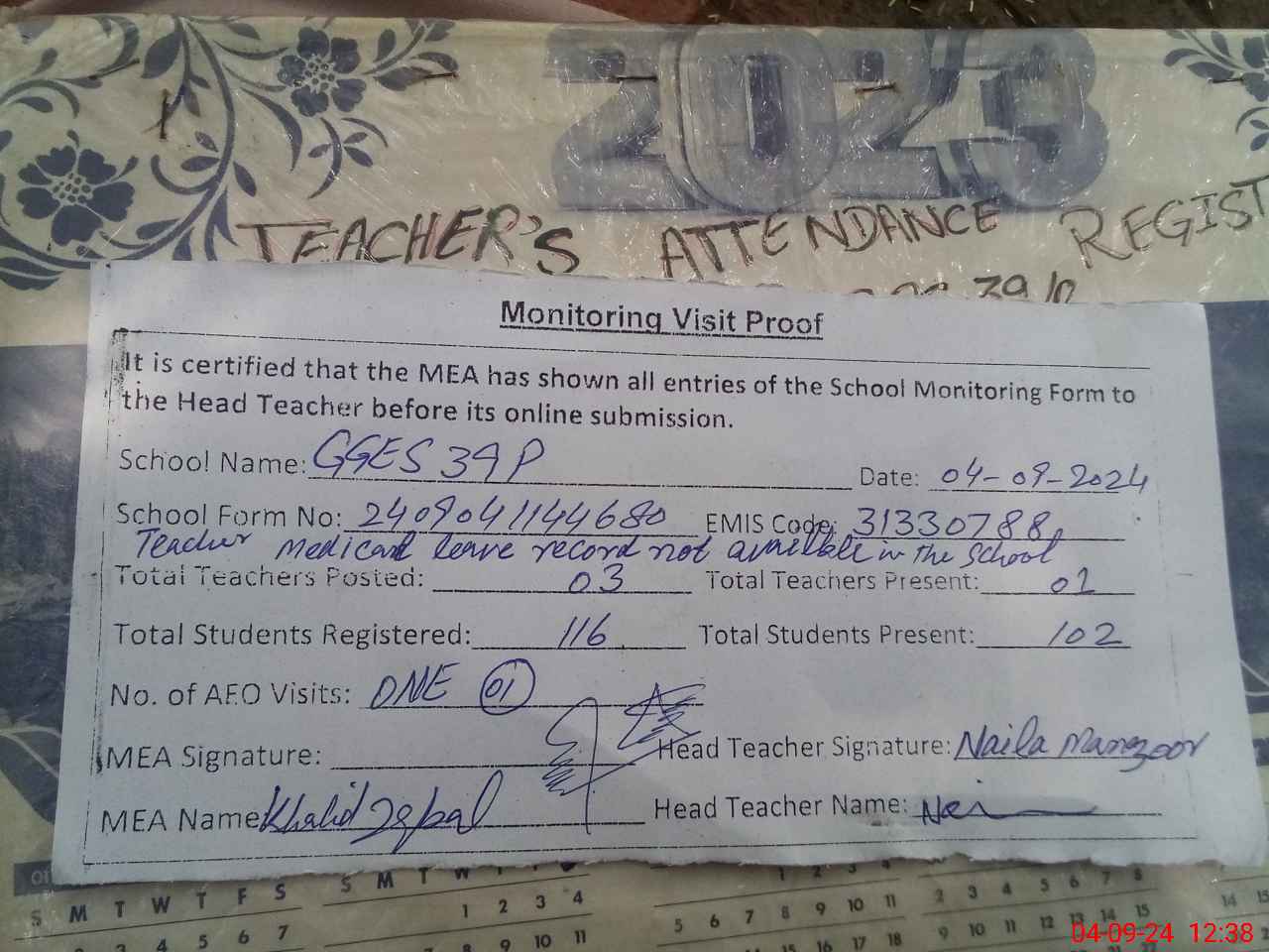 | Remarks (Use Separate Page if Required): Class verification is not updated on mea tab as per sis and New building boundary wall not available and Teacher medical leave record not available in the school | |||||