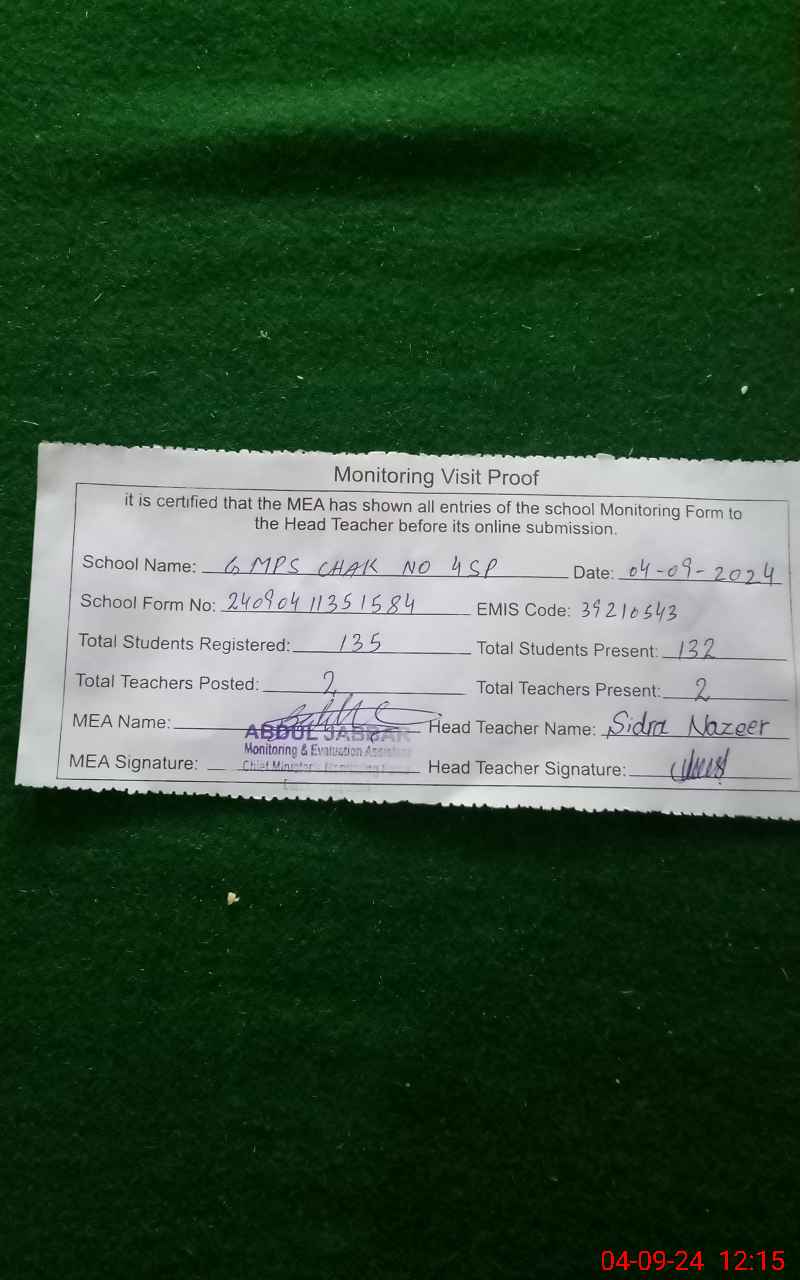 | EMIS Code: 39210543 | Name of School: GMPS CHAK NO. 4/SP | |||