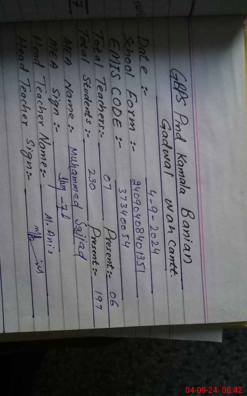 | EMIS Code: 37340054 | Name of School: GPS PIND KAMALA BANIAN | |||