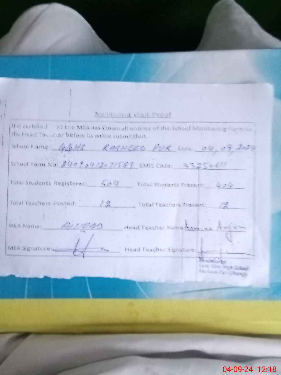 | Attendance Register | Head Teacher | MEA with School | Visit Proof |