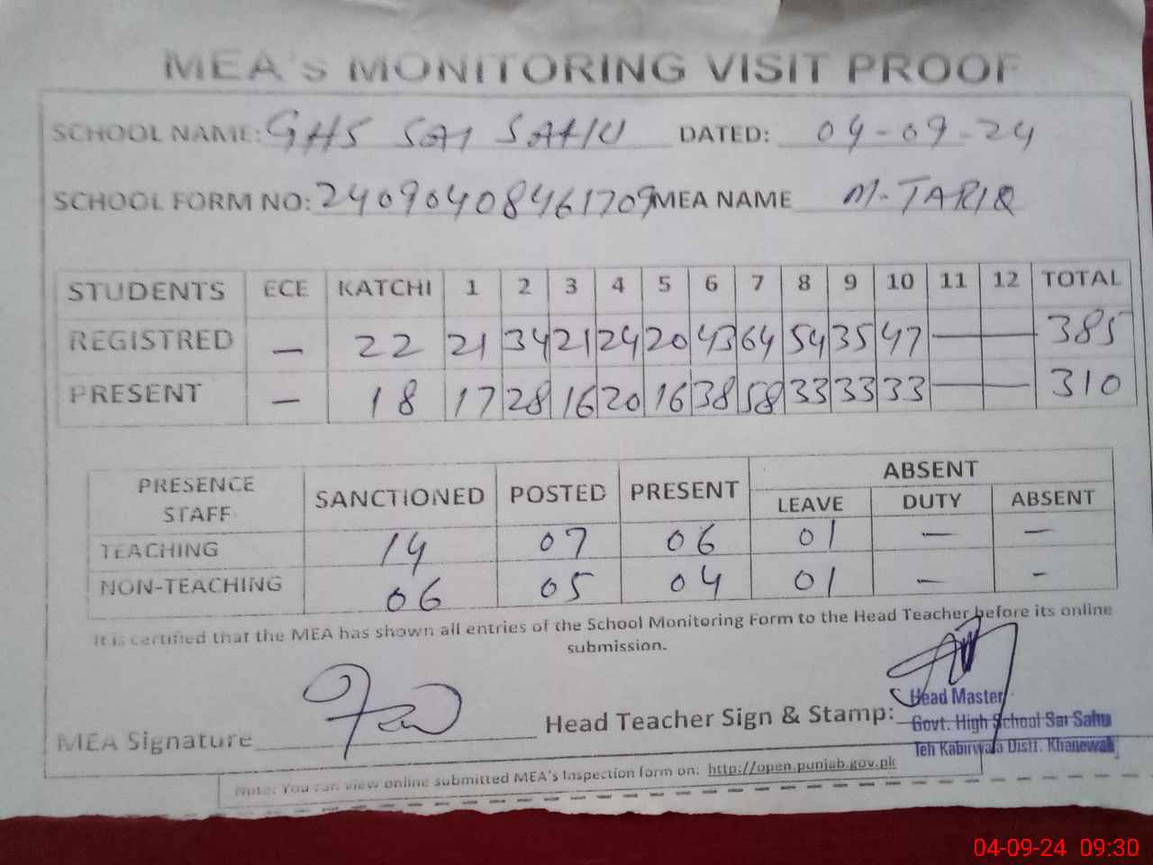 | Attendance Register | Head Teacher | MEA with School | Visit Proof |