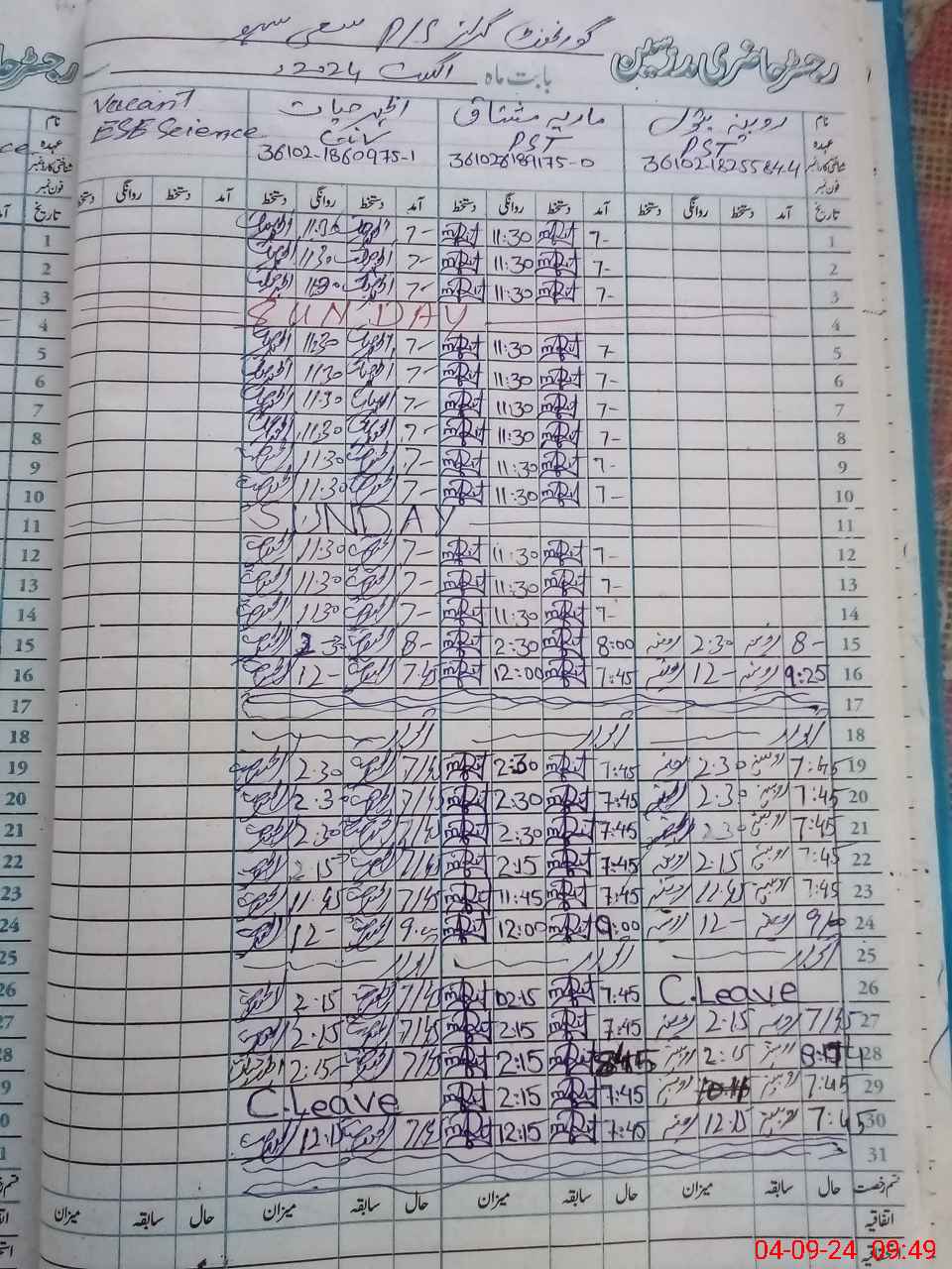 | CNIC | Full Name | Designation | R/C | Absence During Last Calender Month |
