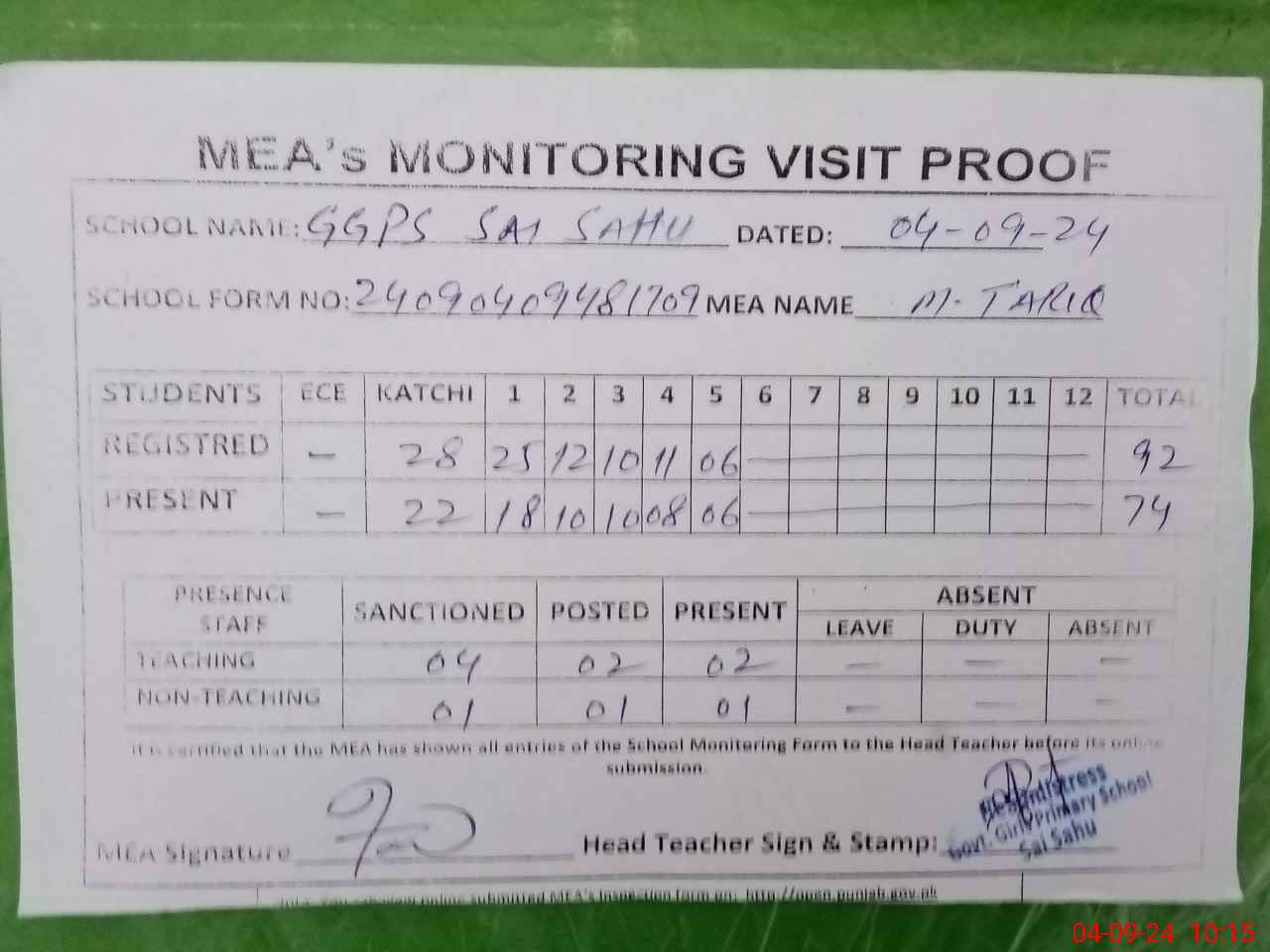| Attendance Register | Head Teacher | MEA with School | Visit Proof |