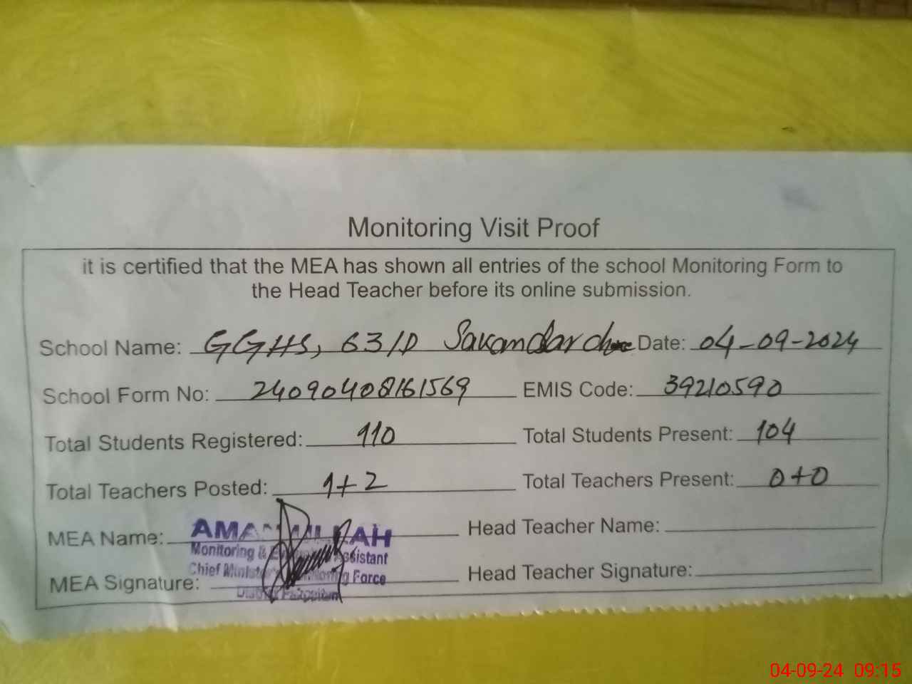 | Attendance Register | Head Teacher | MEA with School | Visit Proof |