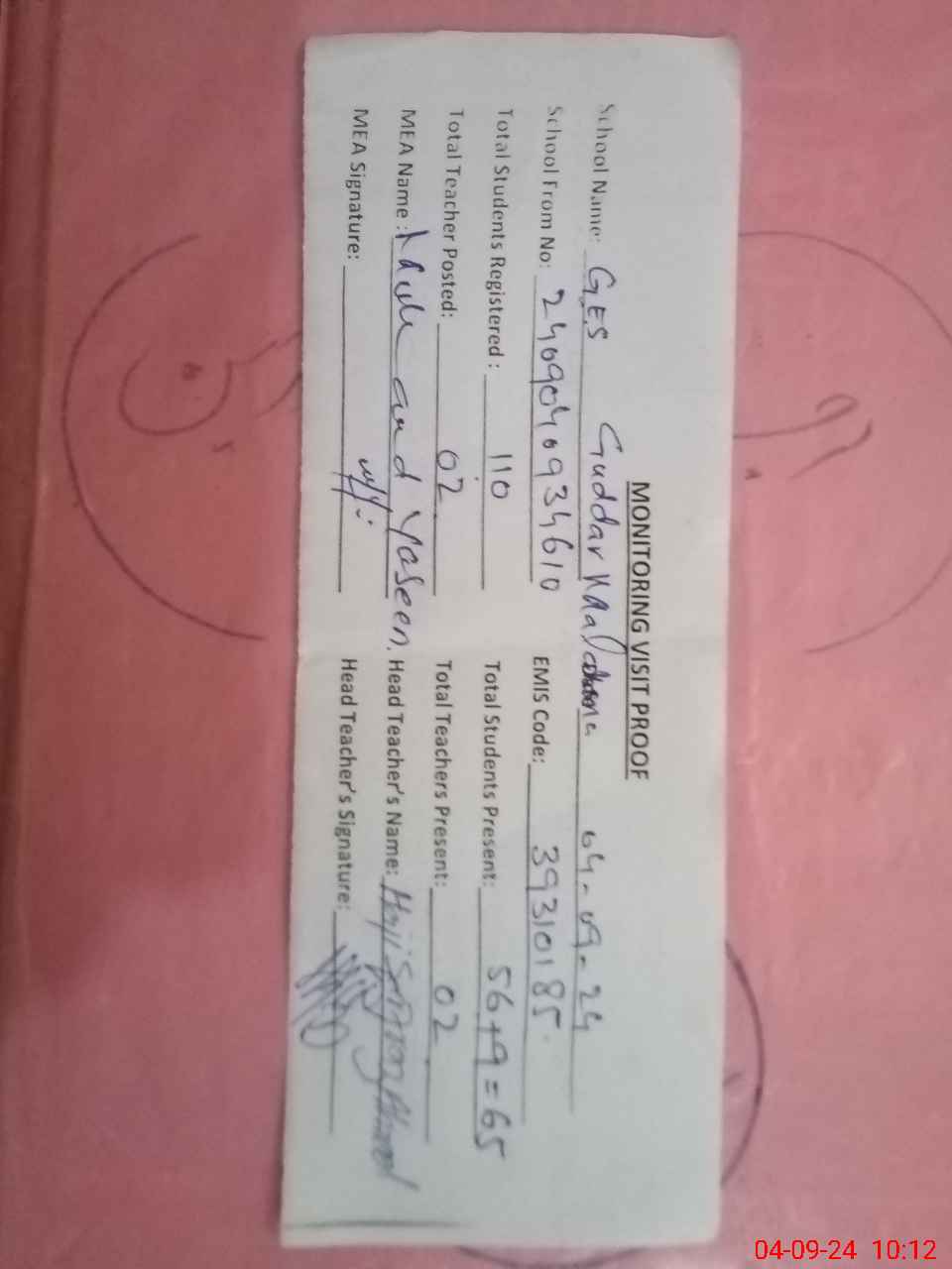 | Attendance Register | Head Teacher | MEA with School | Visit Proof |