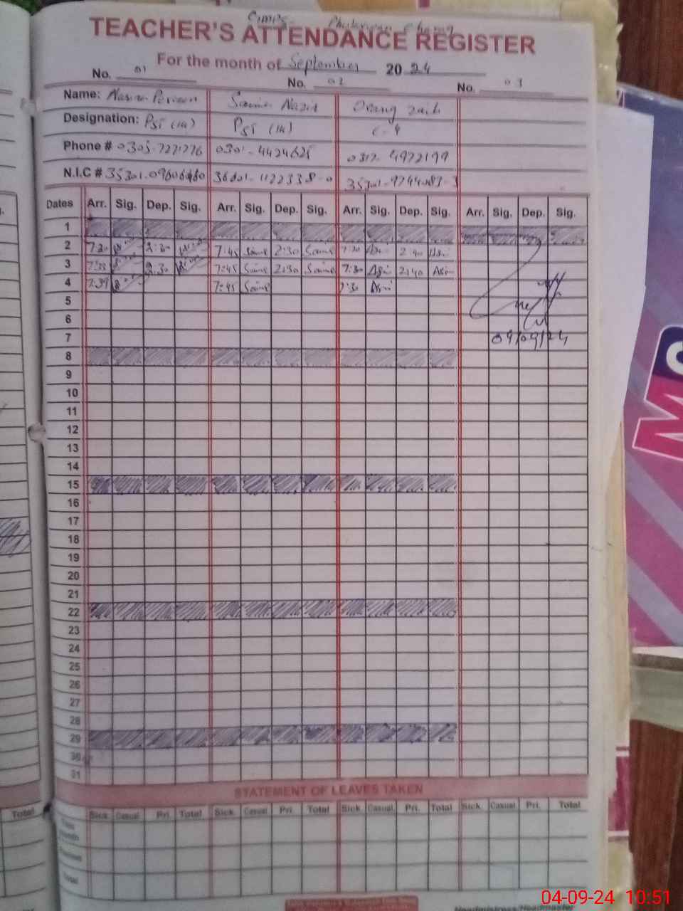 | Name: NA**** PE**** Designation: (School Headmaster's/Headmistress's) ESE (ARTS) Phone/Cell Number: 03**** |