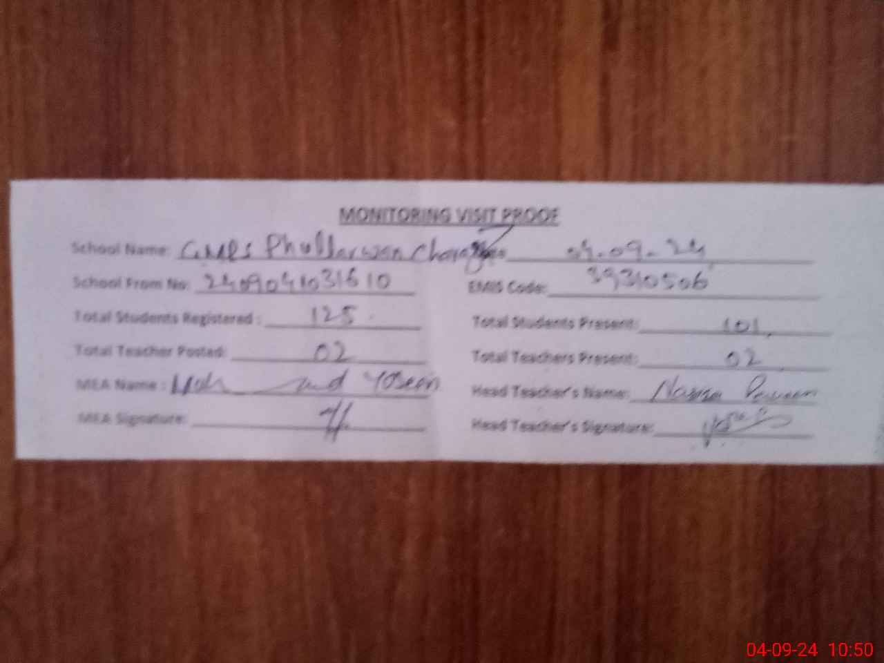 | EMIS Code: 39310506 | Name of School: GMPS PHULLAR WAN CHRAGH | |||