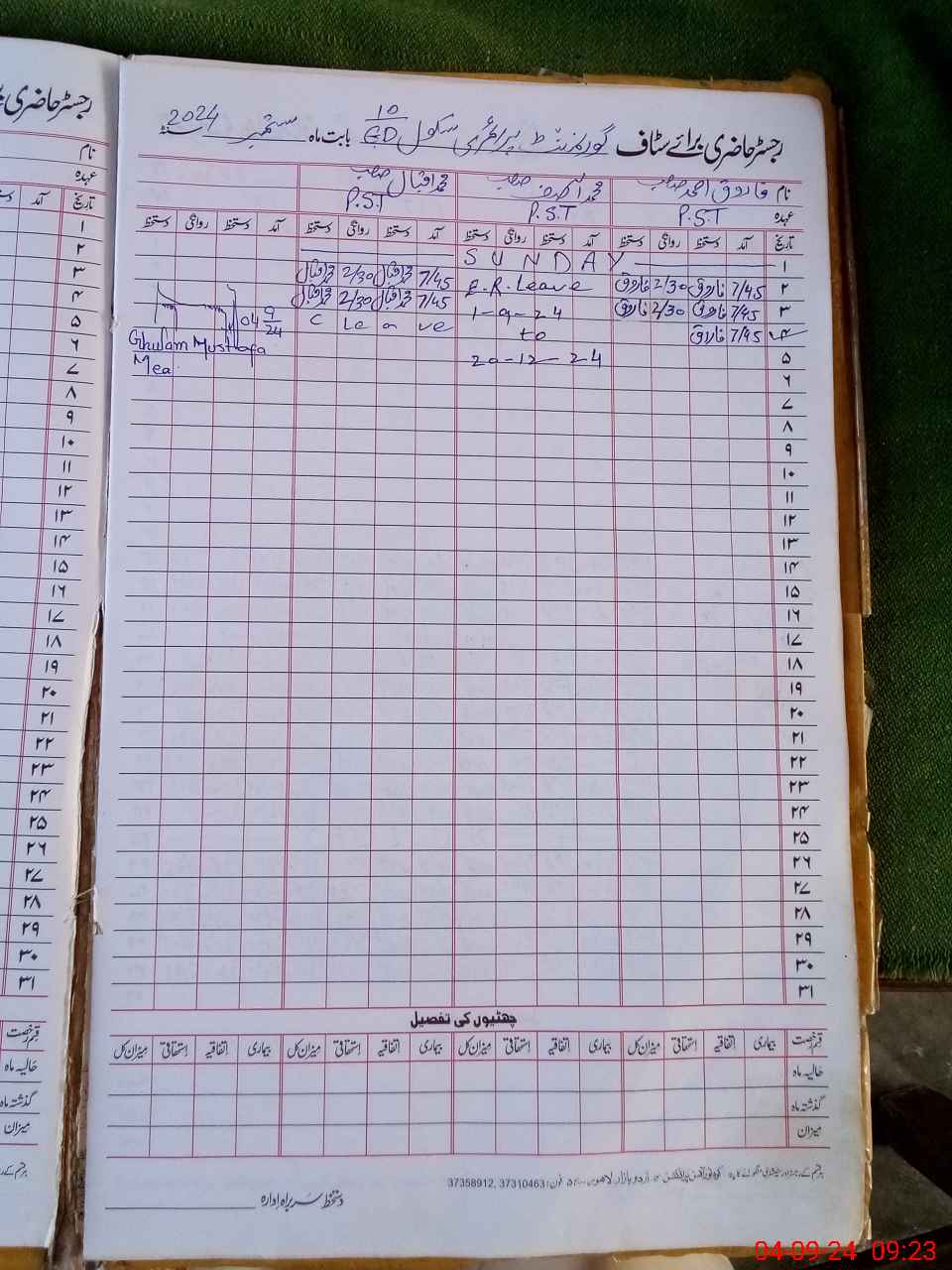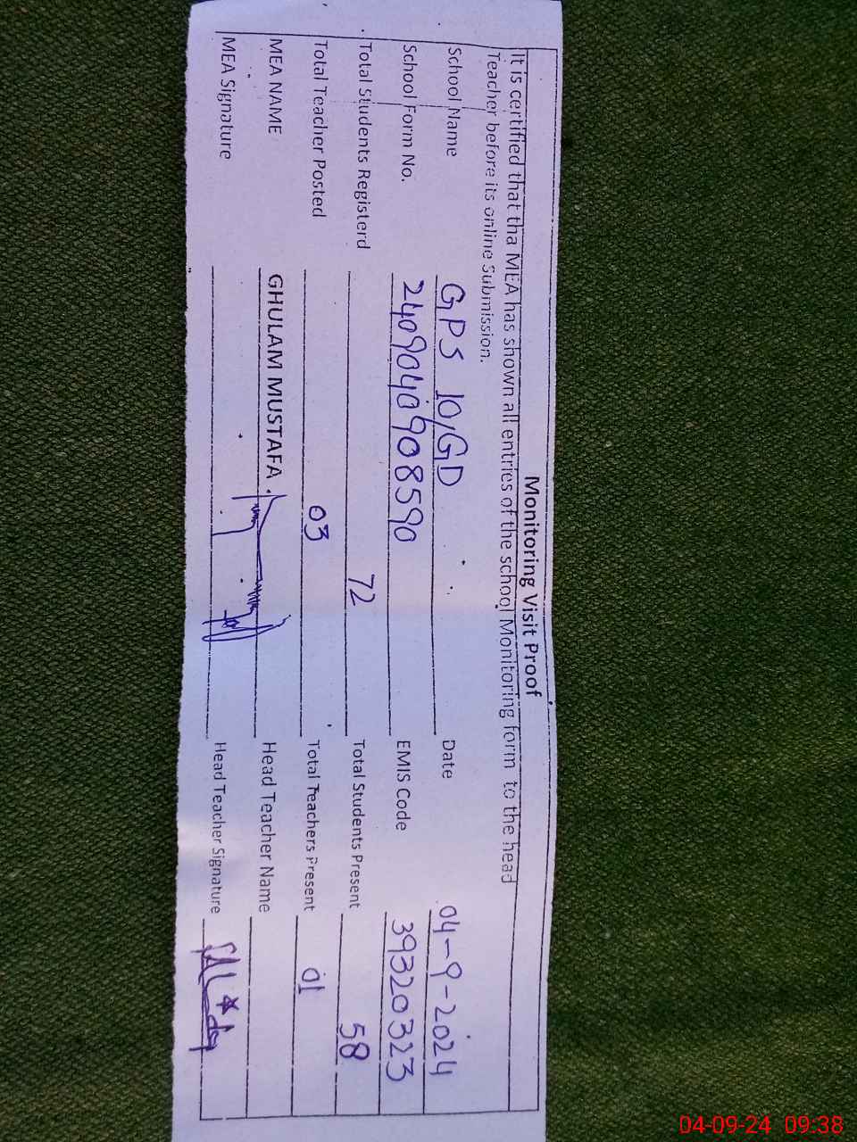 | Name: FA**** AH**** Designation: (School Headmaster's/Headmistress's) PTC/JV Phone/Cell Number: 03**** |