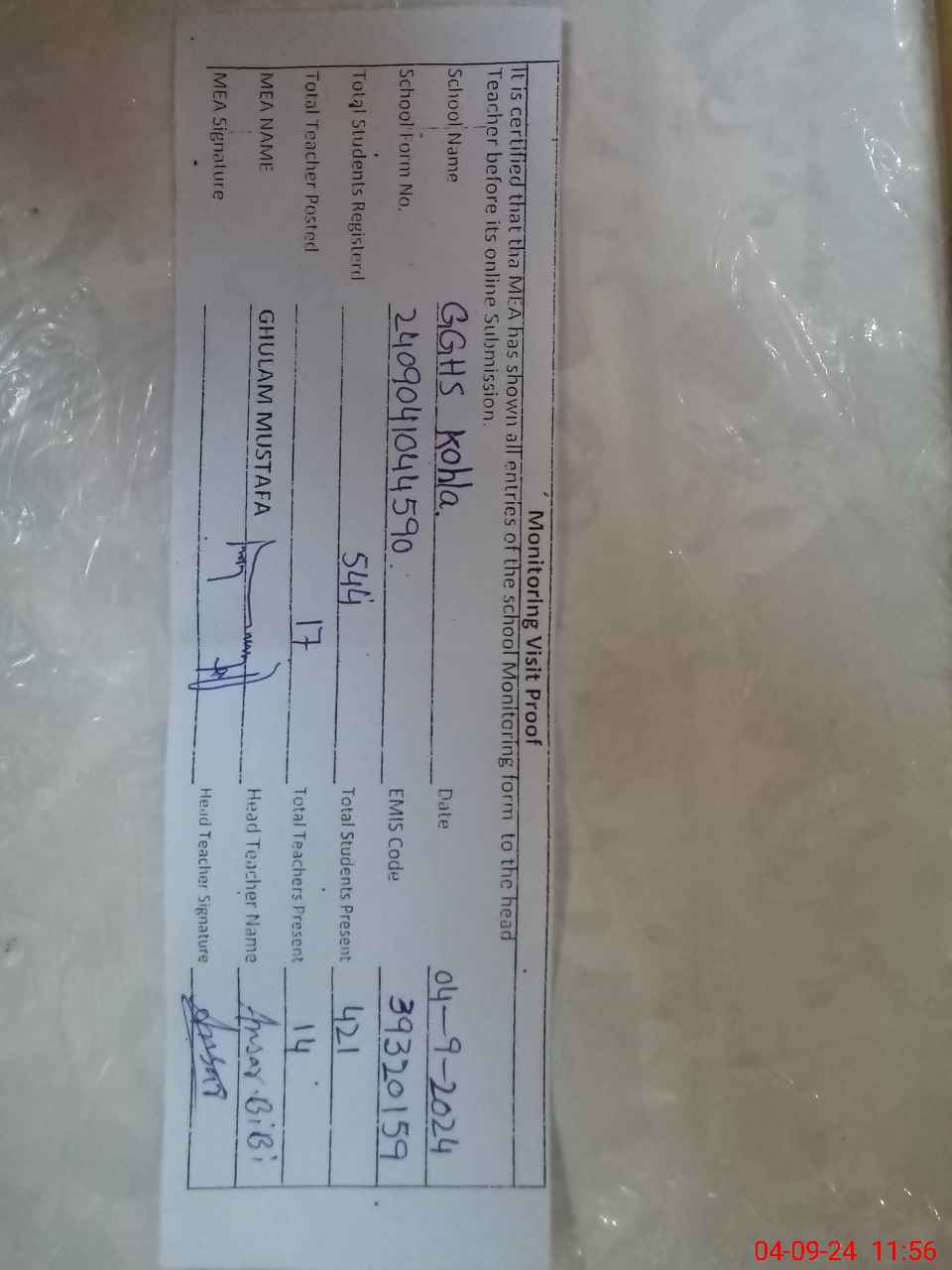 | EMIS Code: 39320159 | Name of School: GGHS KOHLA | |||