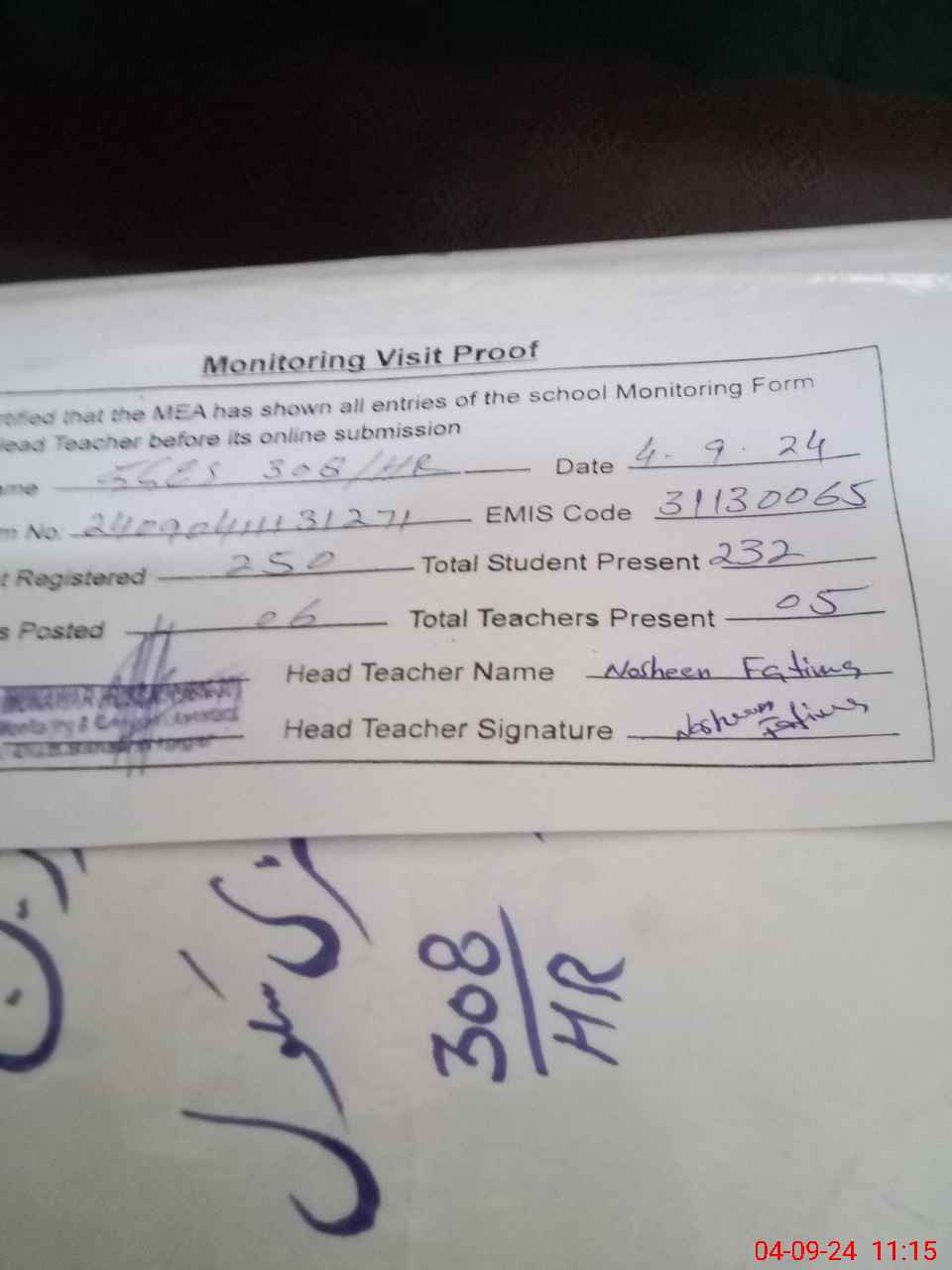 | EMIS Code: 31130065 | Name of School: GGES CHAK NO. 308 HR | |||