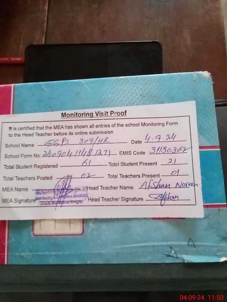 | Attendance Register | Head Teacher | MEA with School | Visit Proof |