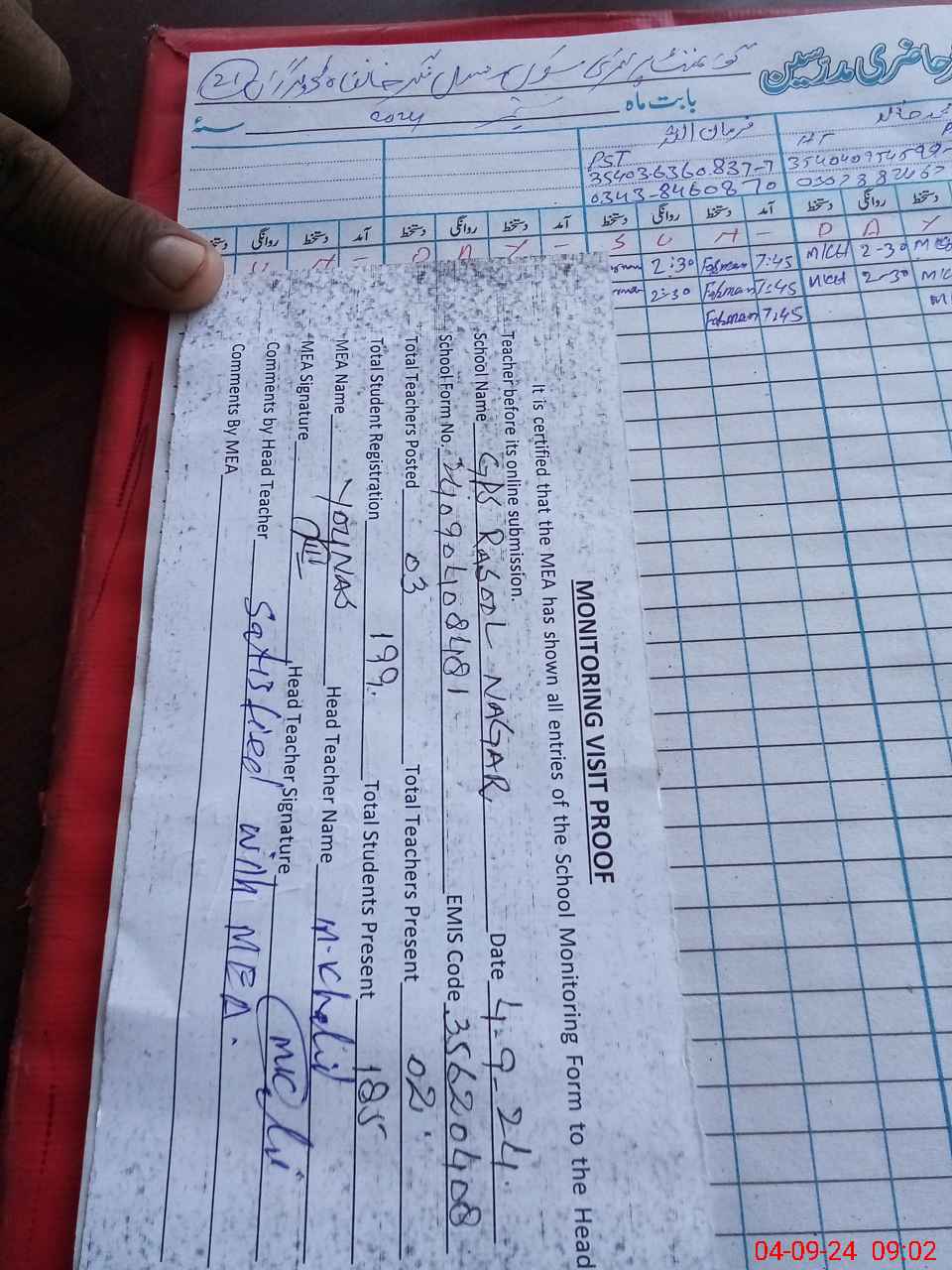 | Attendance Register | Head Teacher | MEA with School | Visit Proof |