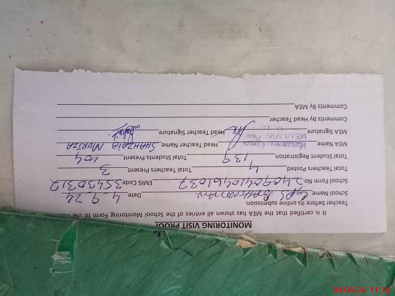 | Attendance Register | Head Teacher | MEA with School | Visit Proof |