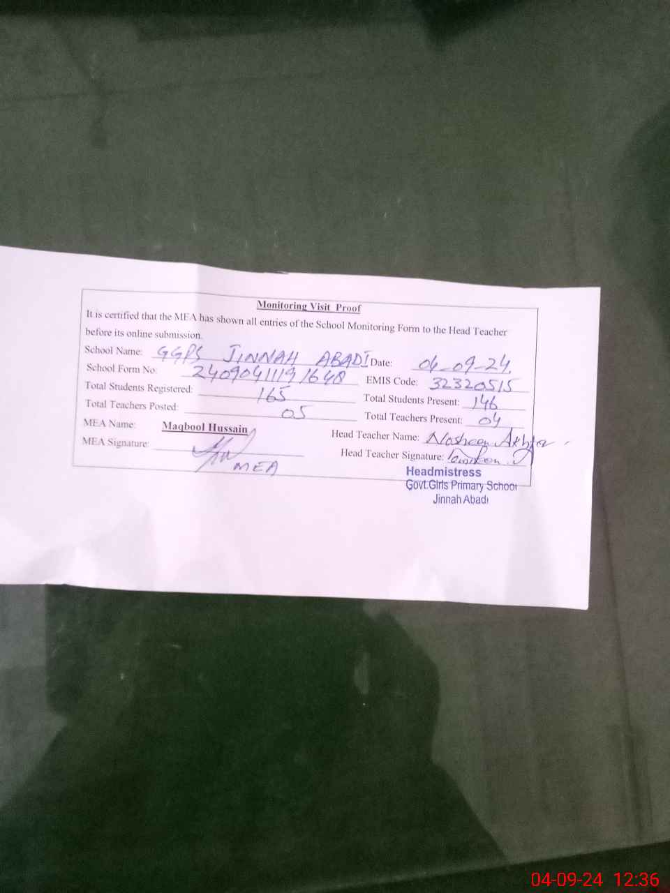 | Attendance Register | Head Teacher | MEA with School | Visit Proof |