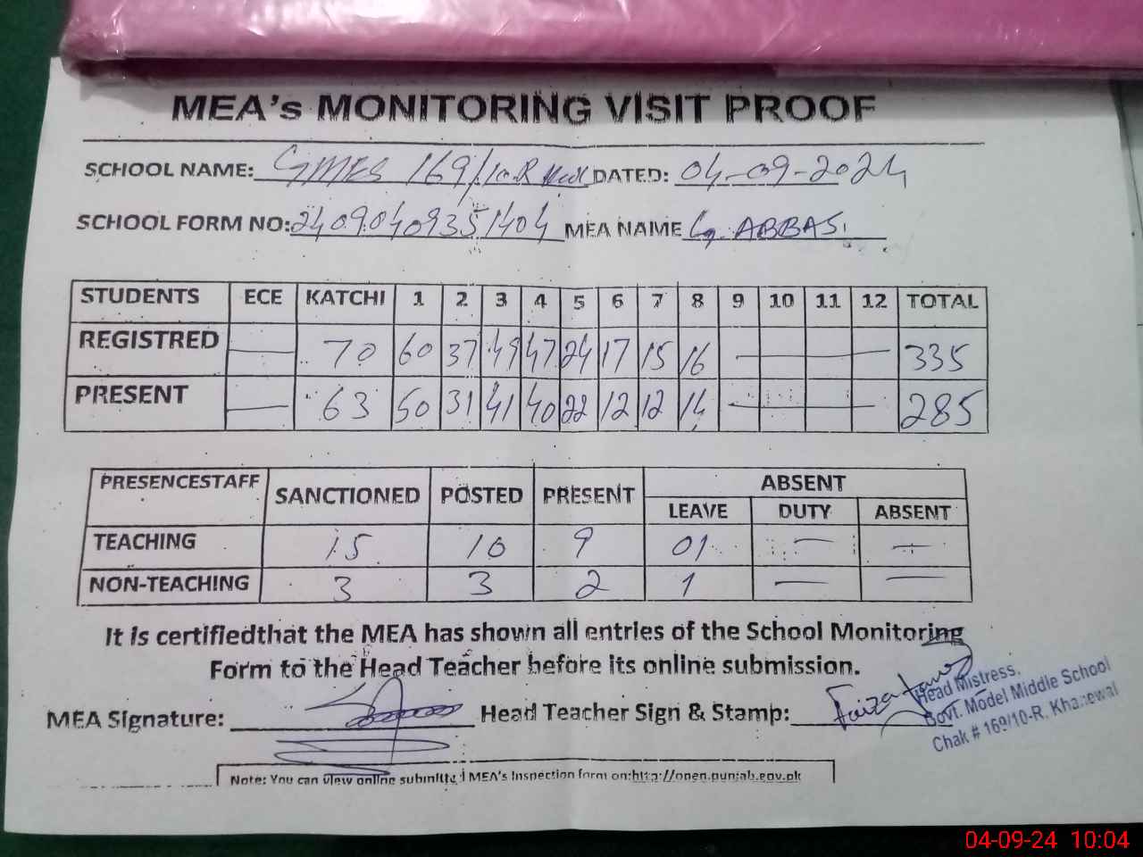 | Certified that this School was Inspected by the Undersigned MEA/DMO Today and the Information Stated Above is as Per Record. | |||||