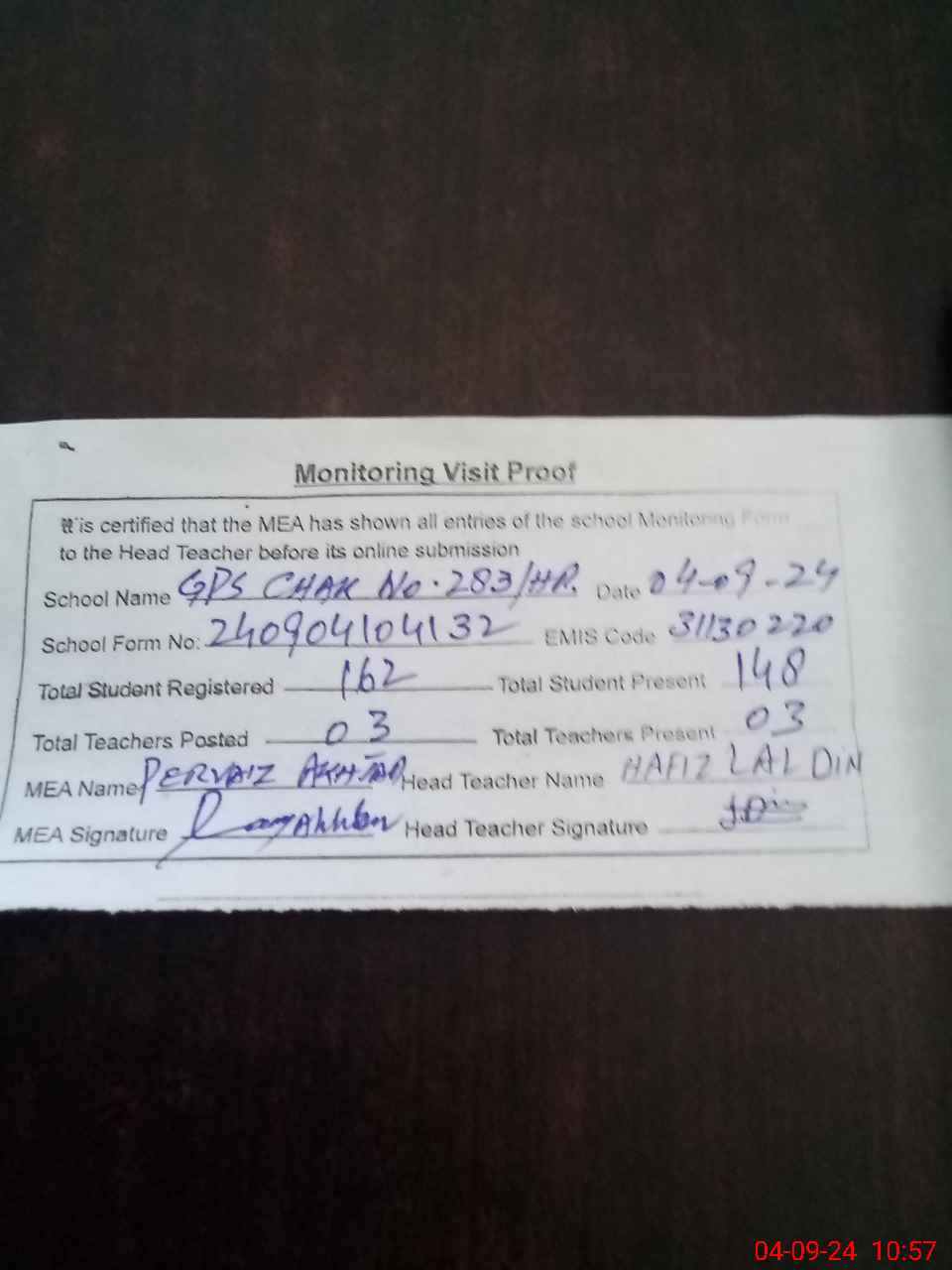 | Attendance Register | Head Teacher | MEA with School | Visit Proof |