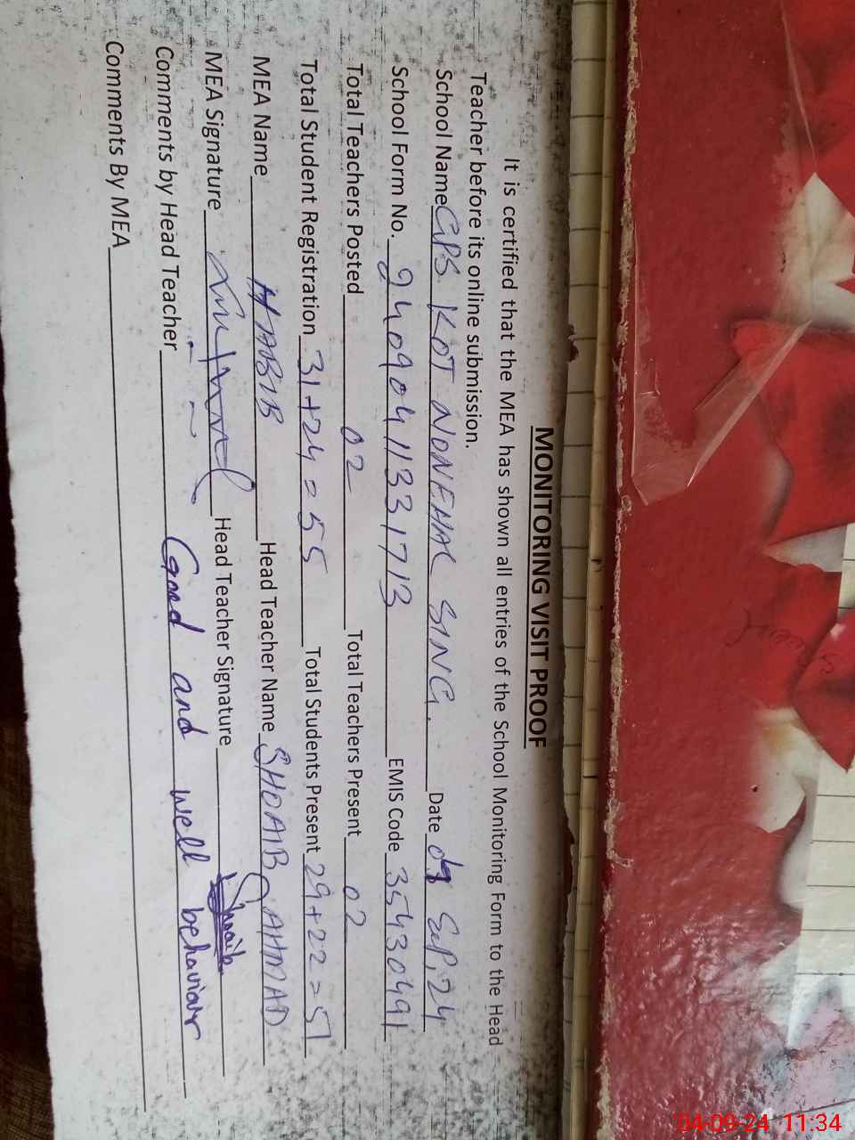 | Attendance Register | Head Teacher | MEA with School | Visit Proof |