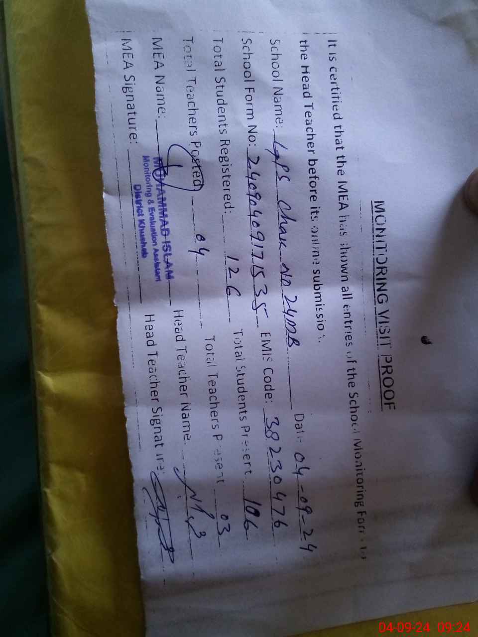| EMIS Code: 38230476 | Name of School: GPS CHAK NO. 24 MB | |||