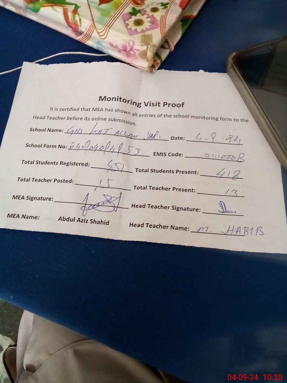 | EMIS Code: 31110008 | Name of School: GHS KAT ALLAH YAR | |||