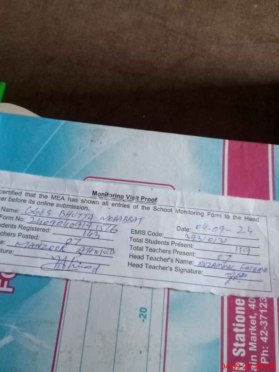 | Attendance Register | Head Teacher | MEA with School | Visit Proof |