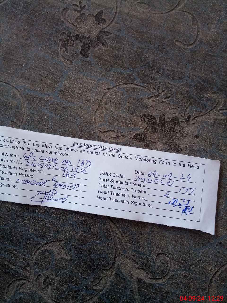 | Attendance Register | Head Teacher | MEA with School | Visit Proof |