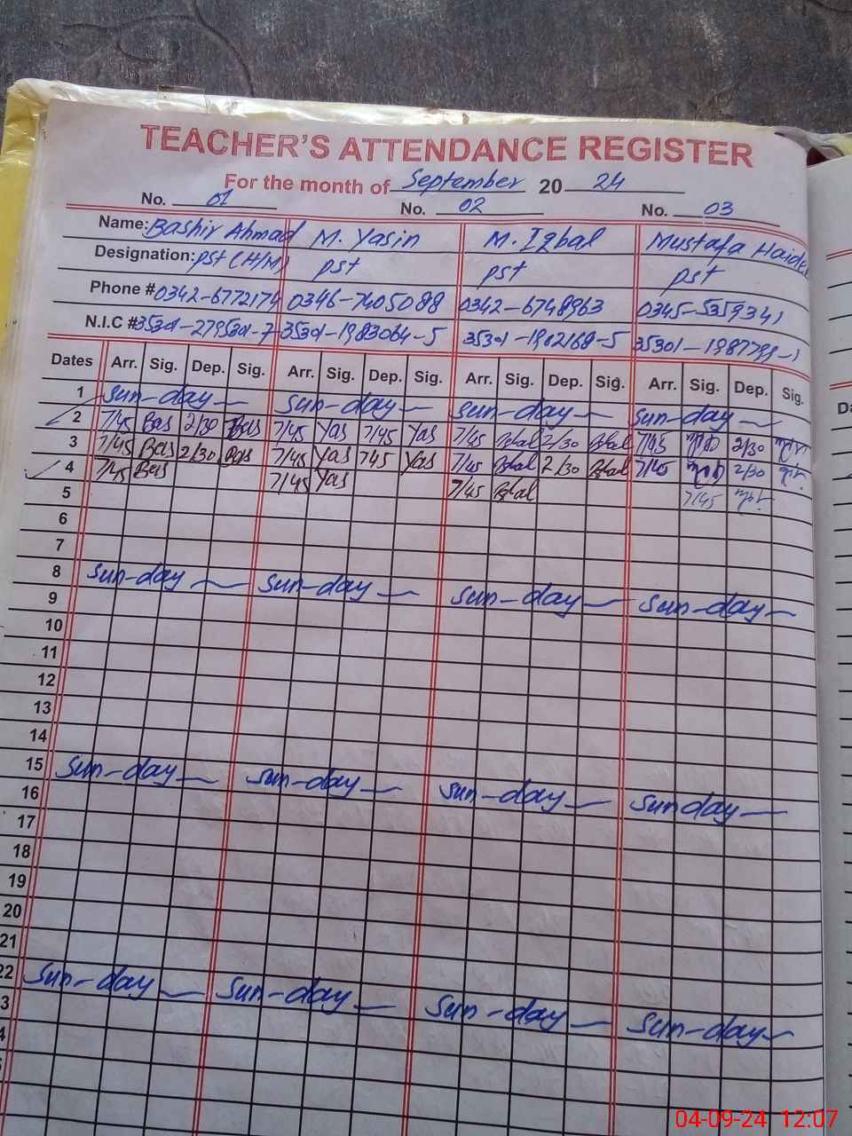 | CNIC | Full Name | Designation | R/C | Absence during last cal. month |