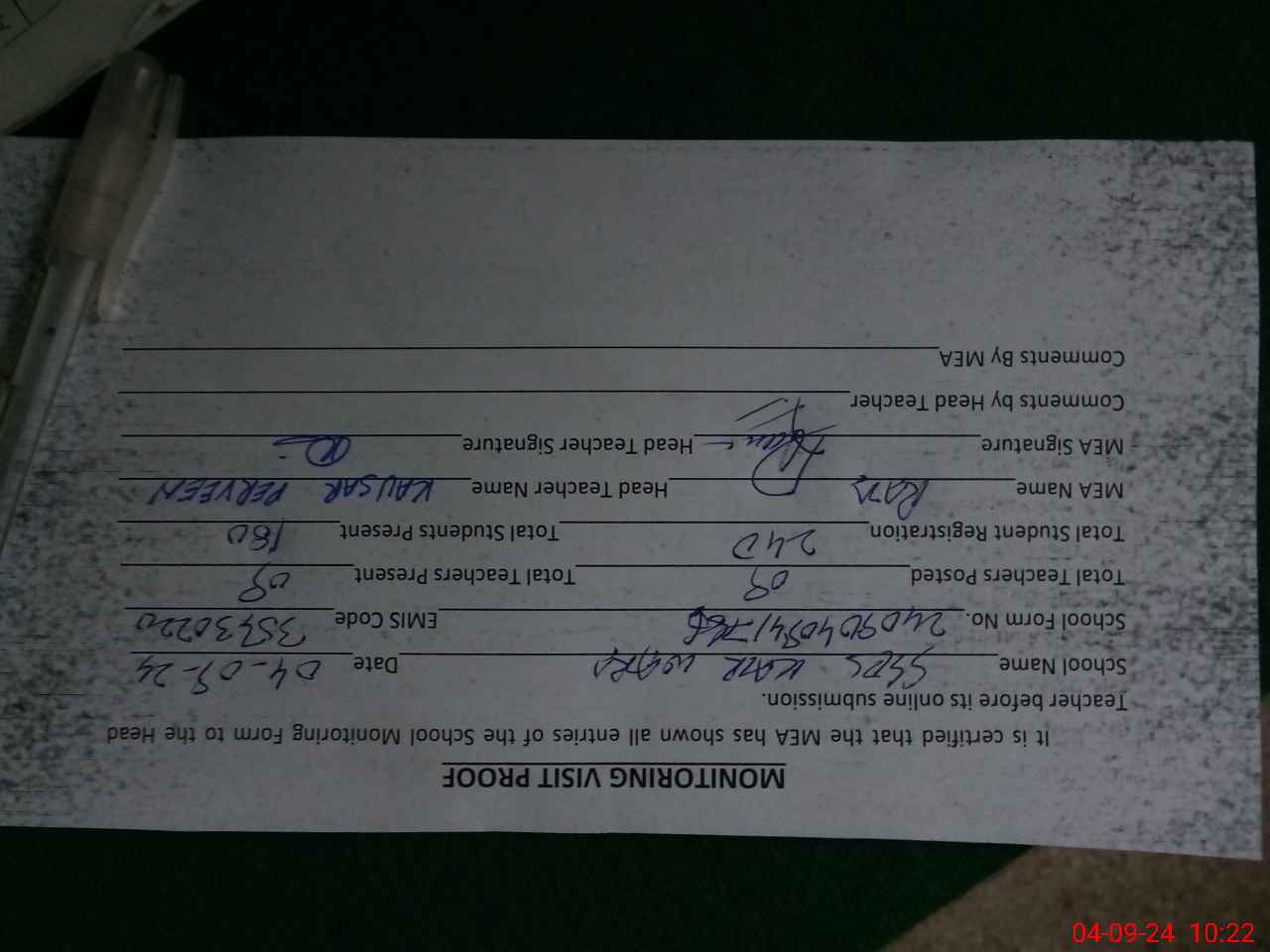 | Attendance Register | Head Teacher | MEA with School | Visit Proof |