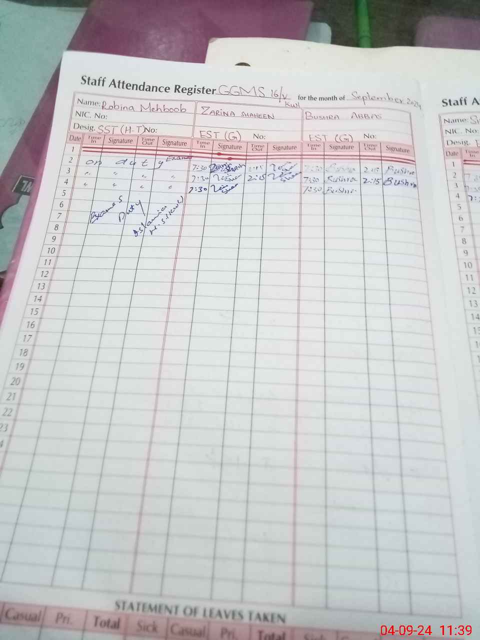 | Leave | Duty | Absent | Maternity | Medical | Ex- Pak |