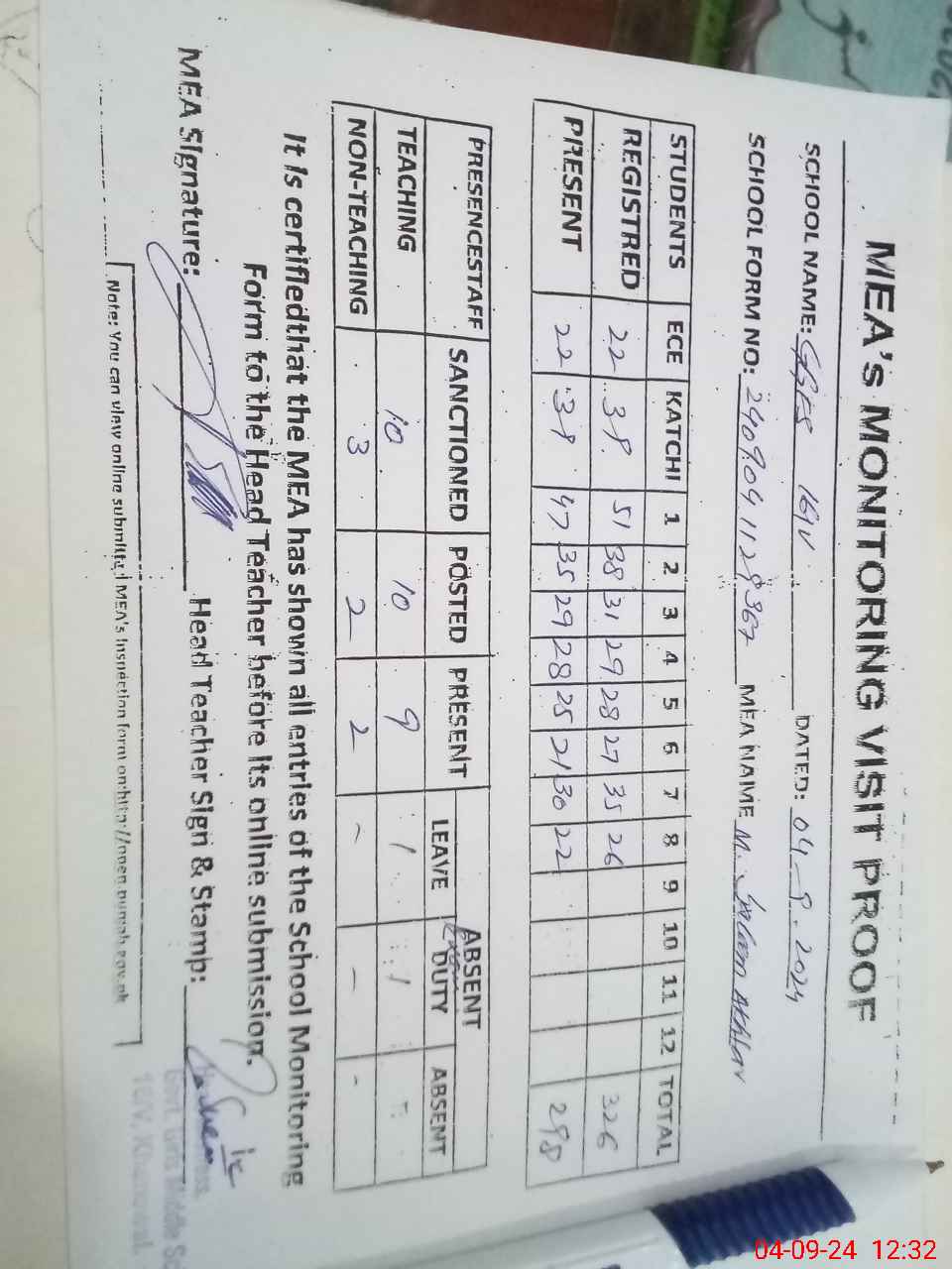 | Attendance Register | Head Teacher | MEA with School | Visit Proof |