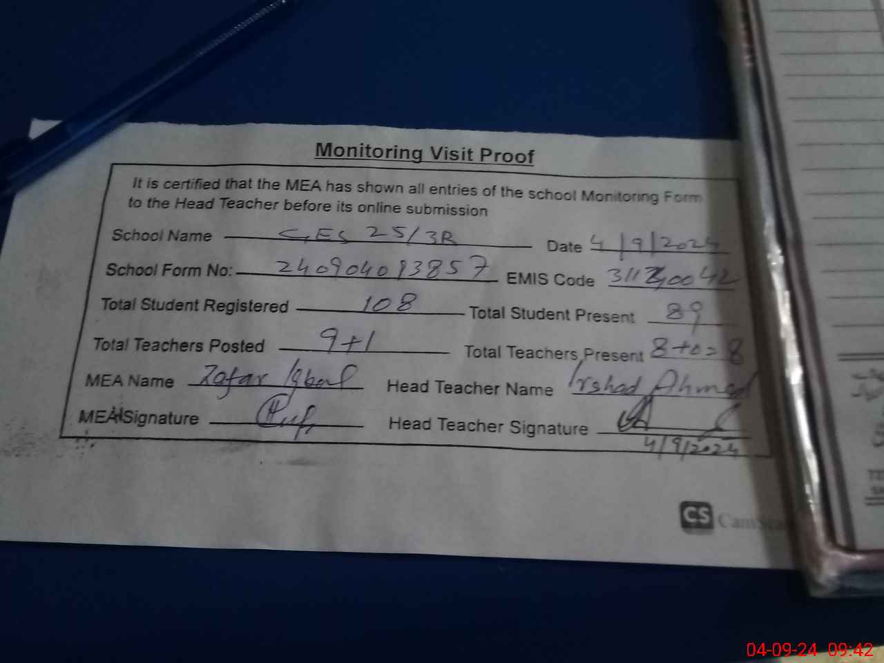| EMIS Code: 31140042 | Name of School: GES CHAK NO. 25/3-R | |||
