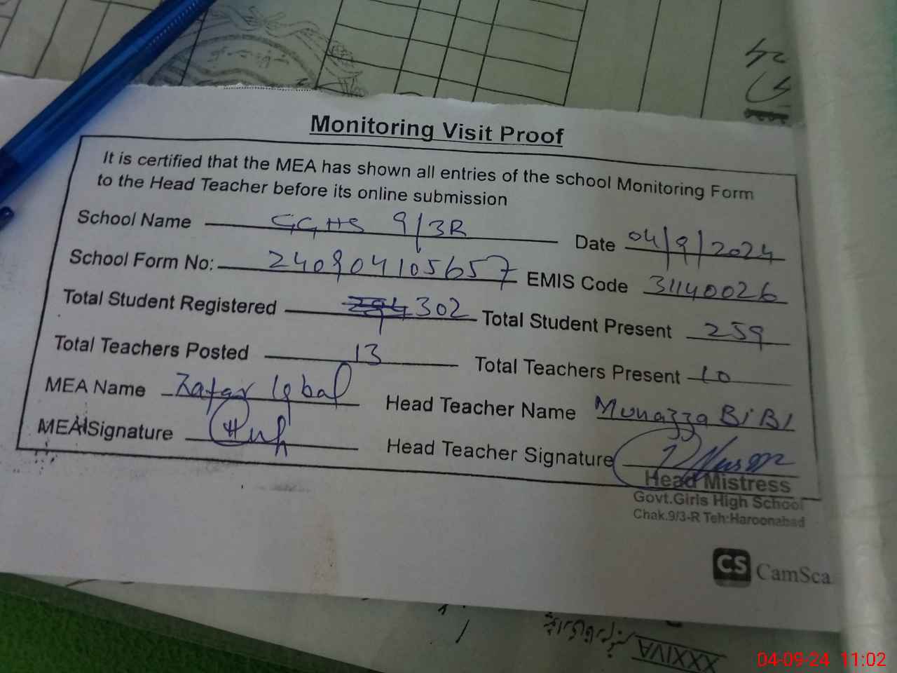 | EMIS Code: 31140026 | Name of School: GGHS CHAK NO 9/3-R | |||