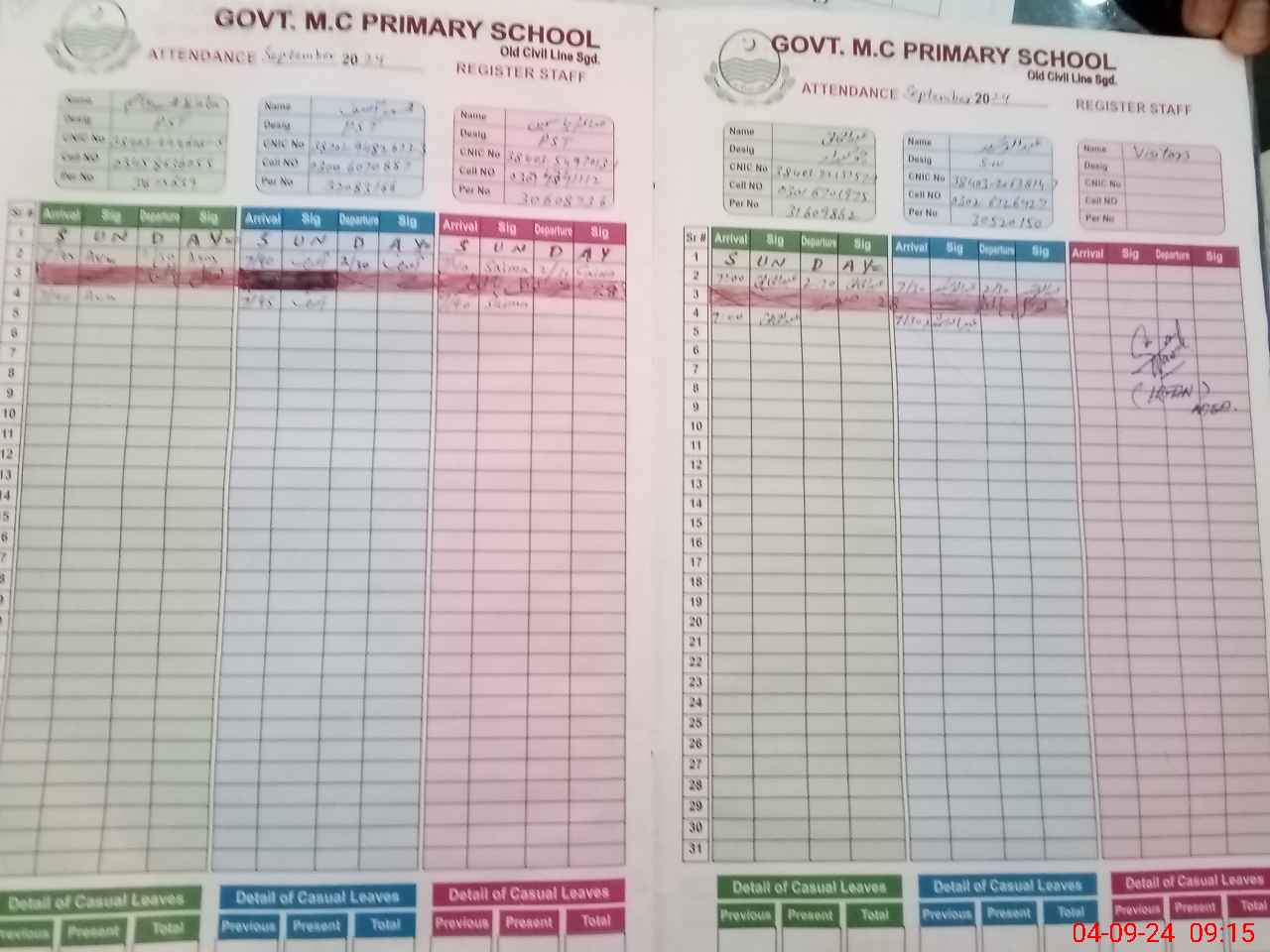 | CNIC | Full Name | Designation | R/C | Absence During Last Calender Month |