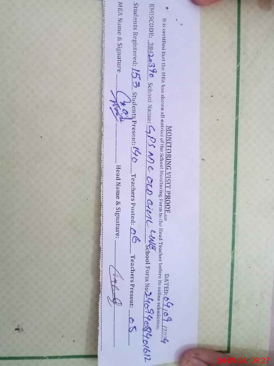 | Attendance Register | Head Teacher | MEA with School | Visit Proof |