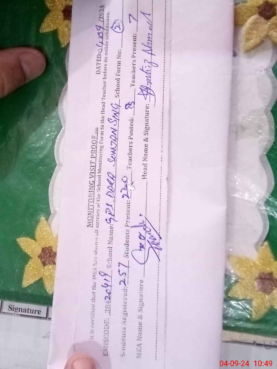 | Attendance Register | Head Teacher | MEA with School | Visit Proof |
