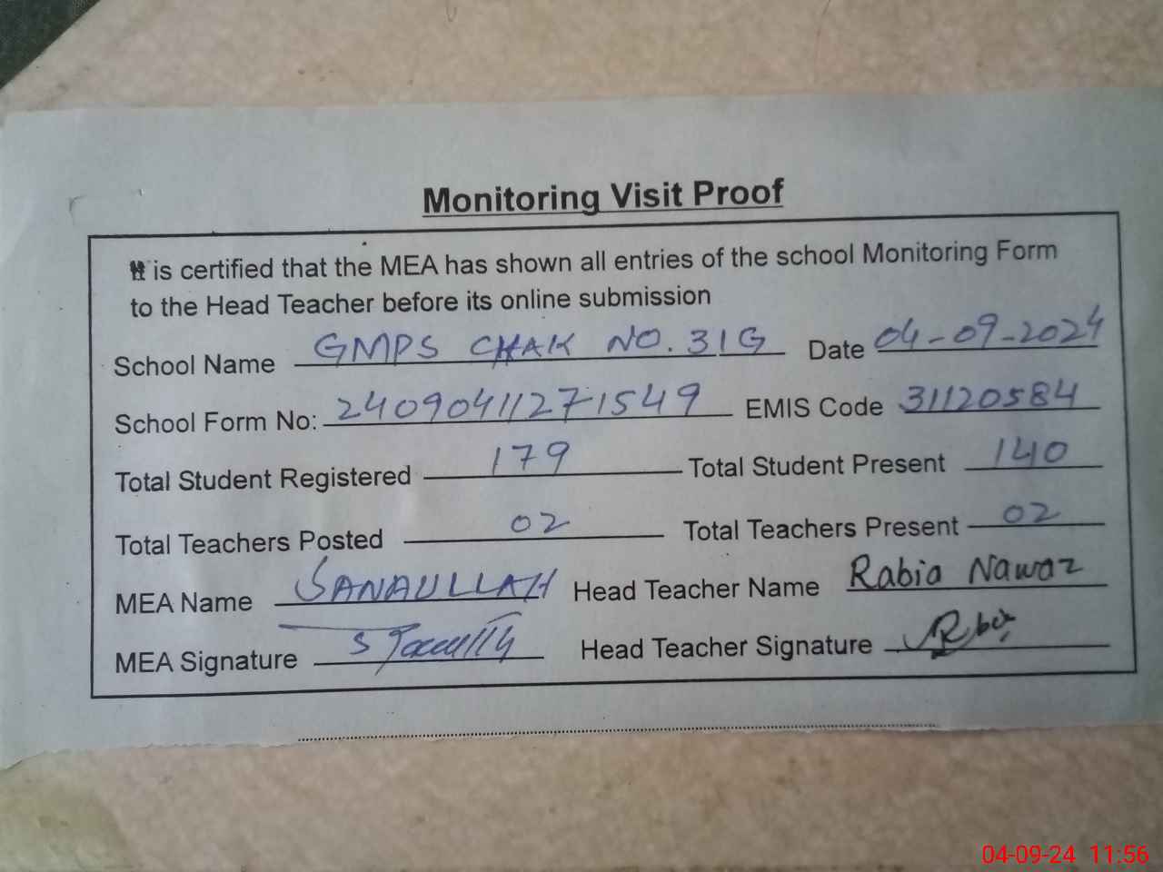 | Attendance Register | Head Teacher | MEA with School | Visit Proof |