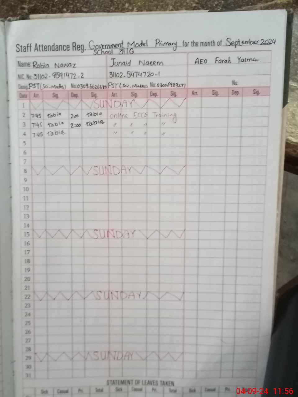 | CNIC | Full Name | Designation | R/C | Absence During Last Calender Month |