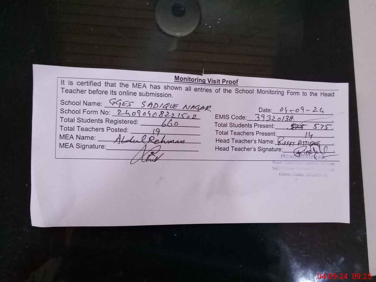 | Attendance Register | Head Teacher | MEA with School | Visit Proof |